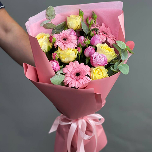 Букет "Беверли-Хиллз" из гербер, роз Баттеркап и эвкалипта