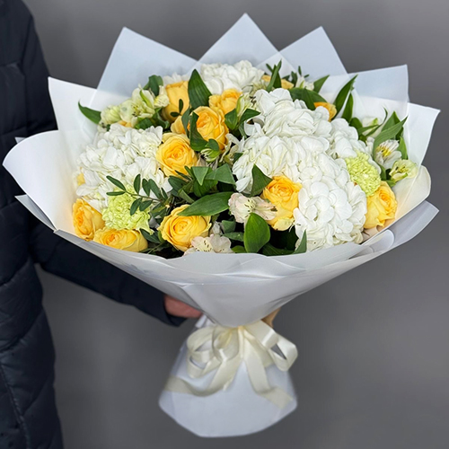 Букет "Лавли" из гортензий, пионовидных роз Баттеркап, альстромерий и диантусов