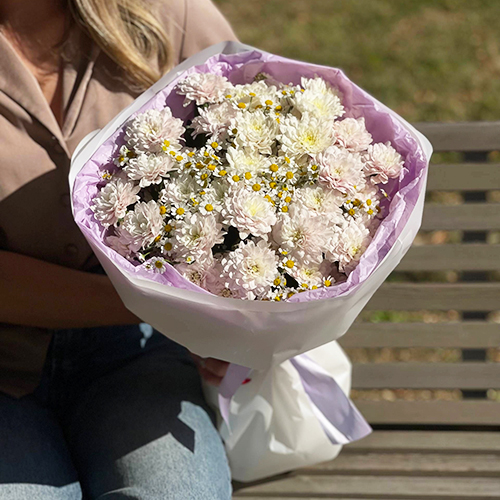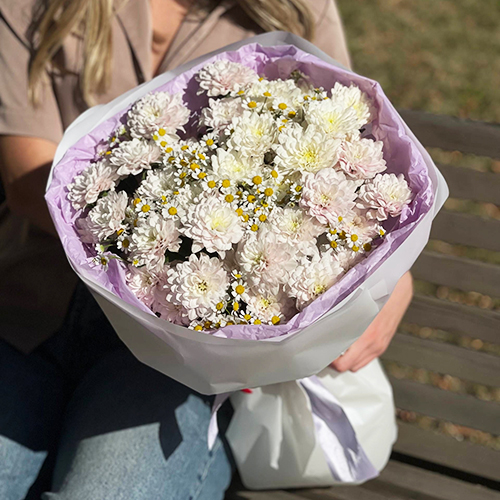 Букет "Нежный взгляд" из кустовых хризантем и ромашек