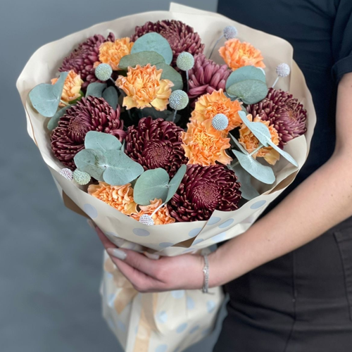 Букет "Персиковый раф" из хризантем Бигоуди, краспедии и диантусов