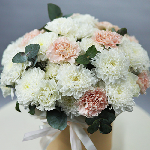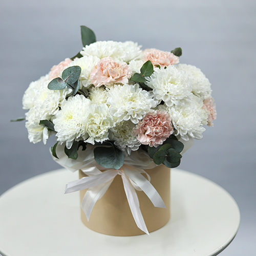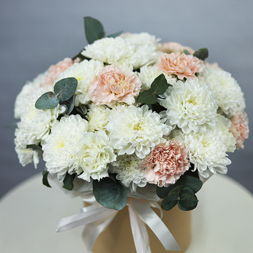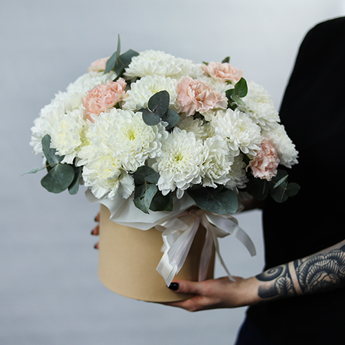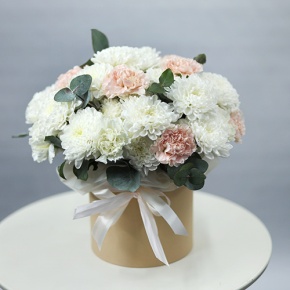 Композиция в шляпной коробке из хризантем, диантусов и эвкалипта