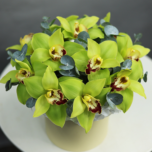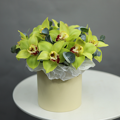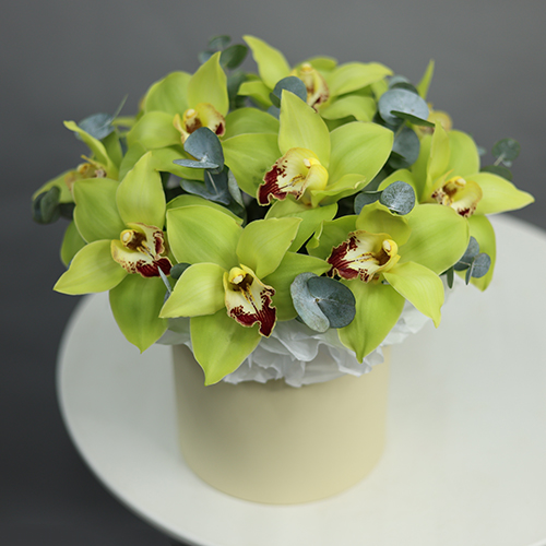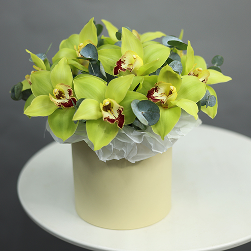 Композиция в шляпной коробке из 11 лаймовых орхидей