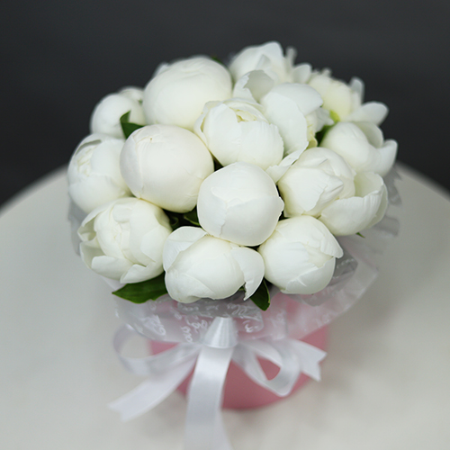 Композиция в шляпной коробке из 15 белых пионов