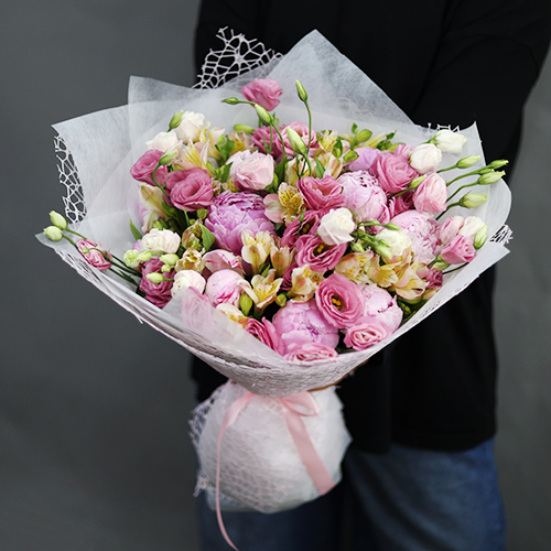 Букет "Луи" из пионов Сара Бернар, розовой эустомы и альстромерии