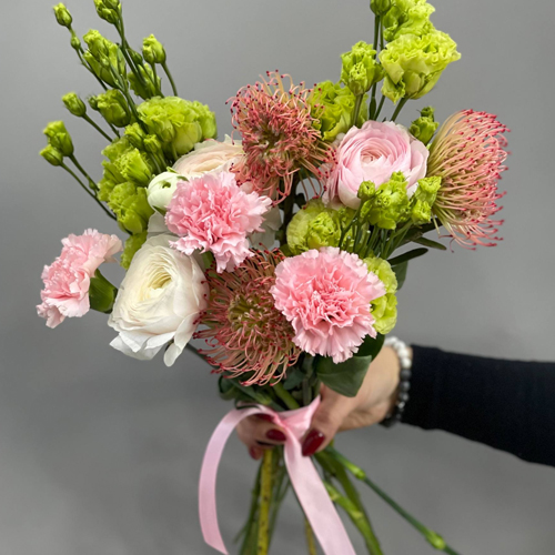 Букет "Фантастический" из ранункулюсов, лейко, эустом и диантусов
