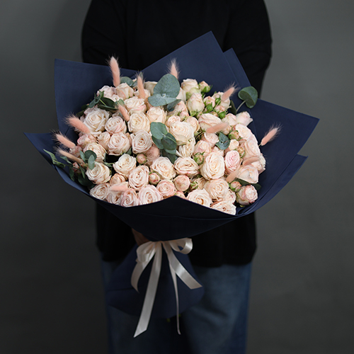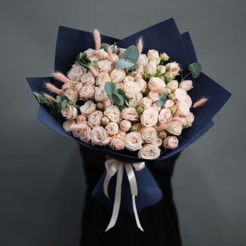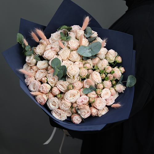 Букет "Вумен" из кустовых роз пионовидных роз Бомбастик, эвкалипта и лагуруса
