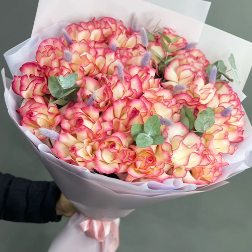 Букет "Альба XL" из французских роз, эвкалипта и веточек лагуруса