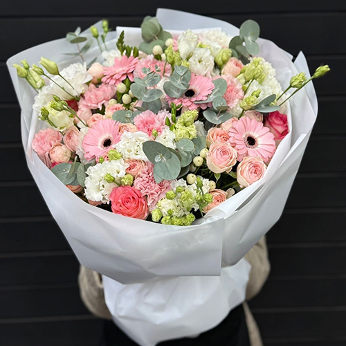 Букет "Ромео" из роз, эвкалипта, гербер, ароматных фрезий, озатамнуса, эустом и диантусов