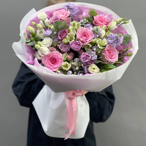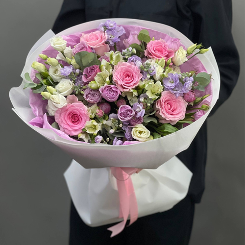 Букет "Хлоя" из альстромерий, кустовых роз, ароматных маттиол, эустом и махровых роз