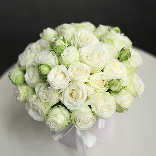 Композиция в шляпной коробке из белых кустовых пионовидных роз
