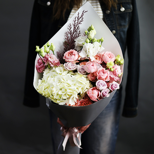 Букет "Иконика" из гортензий, кустовых пионовидных роз Джульетта и эустом