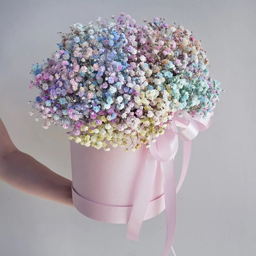 Композиция в шляпной коробке из воздушных радужных гипсофил (цвет коробки в ассортименте)